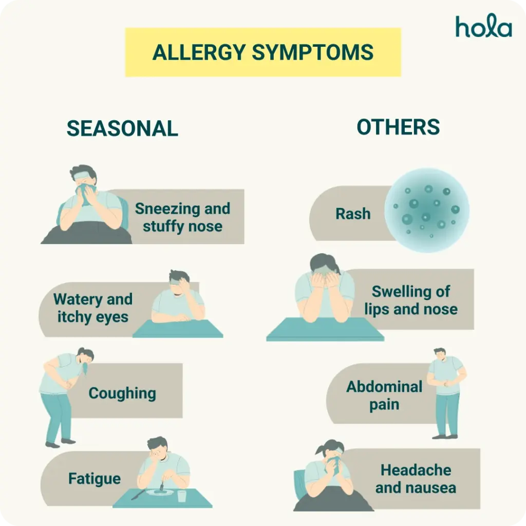 Allergies can have a variety of symptoms depending on the allergen and how it enters the body. Some of the common symptoms of seasonal allergy include sneezing, stuffy nose, watery and itchy eyes, coughing and fatigue. Other symptoms also include rash, cough, swelling of lips or nose, headache, abdominal pain and nausea. Allergies can be the result of various factors, including: